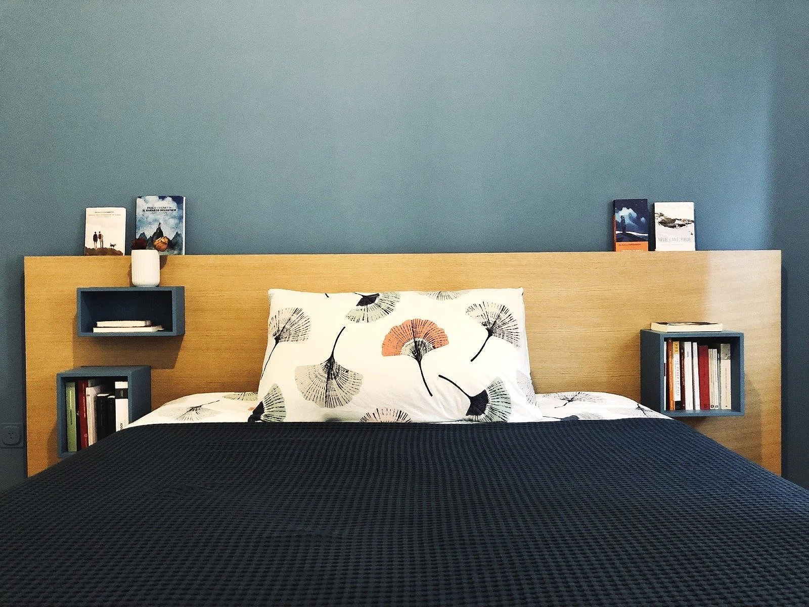 Le scatole che entrano ad incastro nel pannello sono dello stesso colore della parete, quasi come se la parete continuasse attraverso la testata e si trasformasse in comodini e mensole.